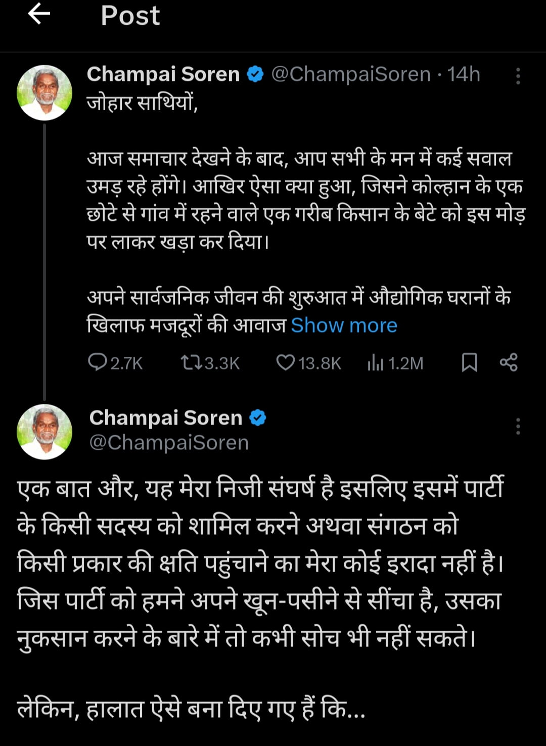 चंपई सोरेन हो गए BJP में शामिल! चंपई का पोस्ट, कर रही है कई सवाल खड़े!